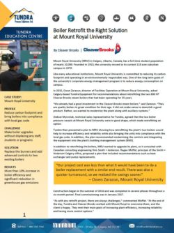 The attached case study examines the result of the Mount Royal University’s boiler room upgrades. This was carried out to reduce their carbon footprint and bring existing boilers in compliance with local gas codes (CSA B149.3 Compliance for Fired-Appliances).